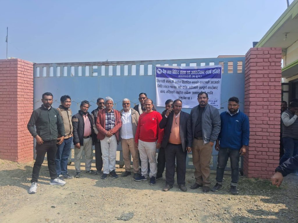नवलपरासी ( बसुप) सरावल-३ अवस्थित प्रकाश बहादुर यादवको नाममा रहेको तिरूपति बालाजी प्रा.लि सुन्दार पाण्डेले २५करोडको चेक दिएर नामसारी गरे जब प्रकाश बहादुर यादव चेक साट्न पुगे खातामा पैसा नभएकाे थाहा पाएपछि बैक तथा वित्तीय संस्था पिडित समन्वय समिति एवं जनसरकार समितिले आज कम्पनीमा ताला लगाइदिएको छ